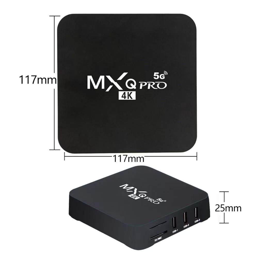 Marca: CAIXA GBLOOX Memória: 1G DDR3,2G DDR3,8G DDR3 Armazenamento interno: 8 GB eMMC,16 GB eMMC,128 GB eMMC Sem fio: Sim Ethernet:100 M Origem: CN (origem) Saída de vídeo: HDMI-compatível 2.0 Sistema Operacional: ANDROID CPU:Rockchip RK3229 Bluetooth: Não Peso: 0,4 Sistema: Android10.0 Potência: DC 5 V, 2A GPU:Mail-G31 MP2 Controle Remoto: Incluído Certificado: CE Modelo Número: MXQ PRO Peso: 0,5